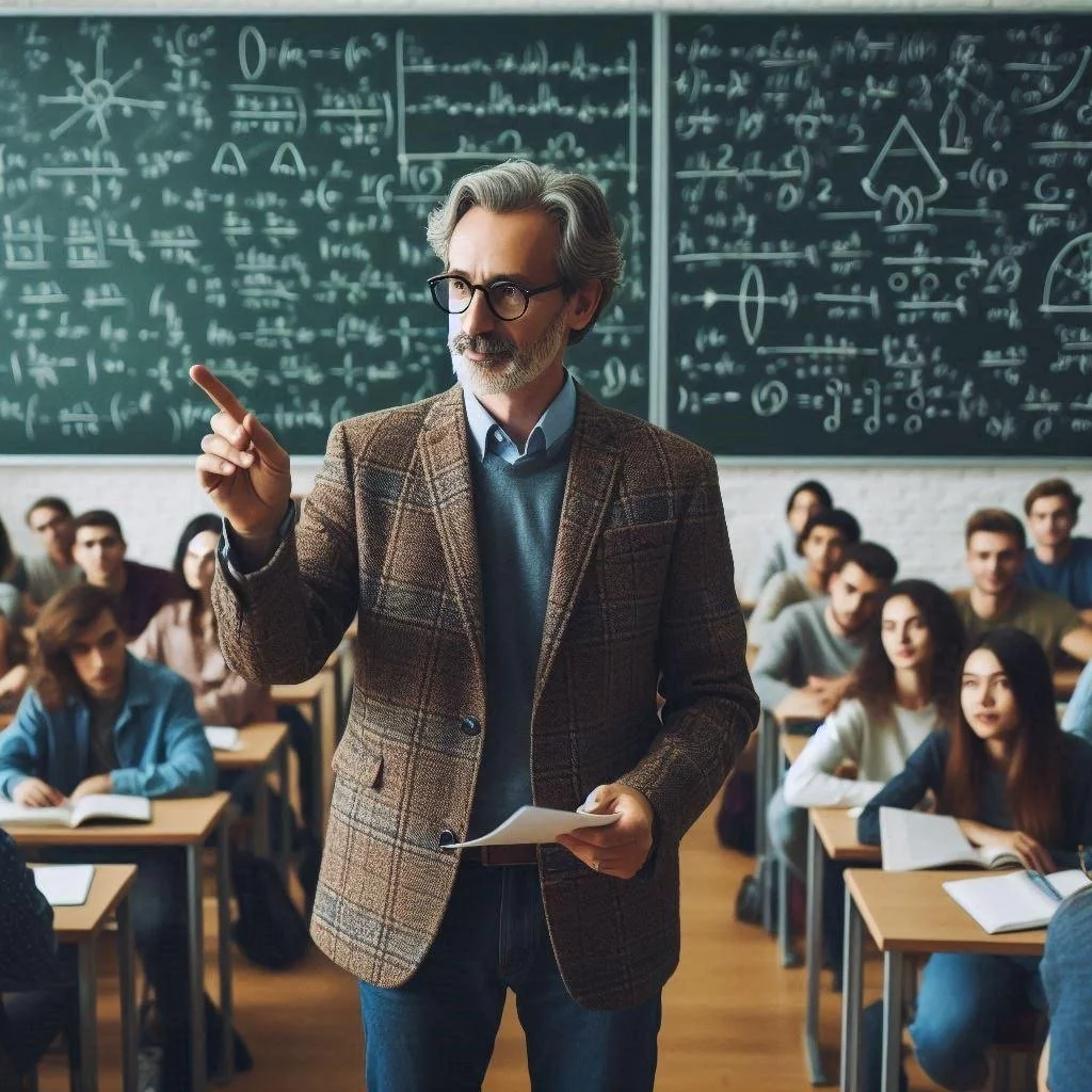 A male professor or teacher with gray hair, glasses, a brown plaid blazer, and a blue sweater, standing in front of a blackboard filled with complex mathematical equations, addressing a classroom of students seated at desks with open books.